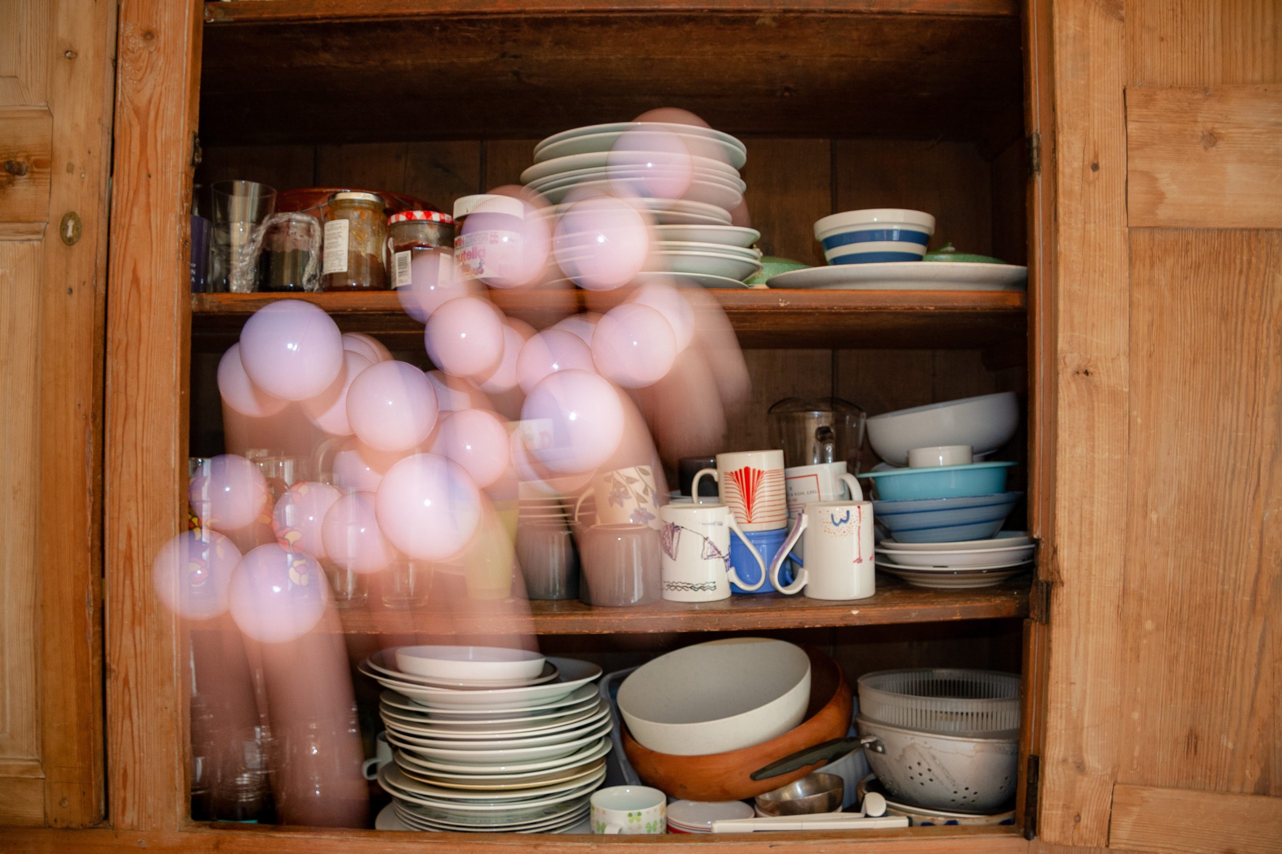 I used automatic camera triggers that fired the shutter in response to changes in movement, sound or light. In Endless Reproduction birds document the human nest, apples photograph themselves falling up trees and balls hang in clusters in front of our vision while futile and wrong-headed experiments flash intermittently in the dark.