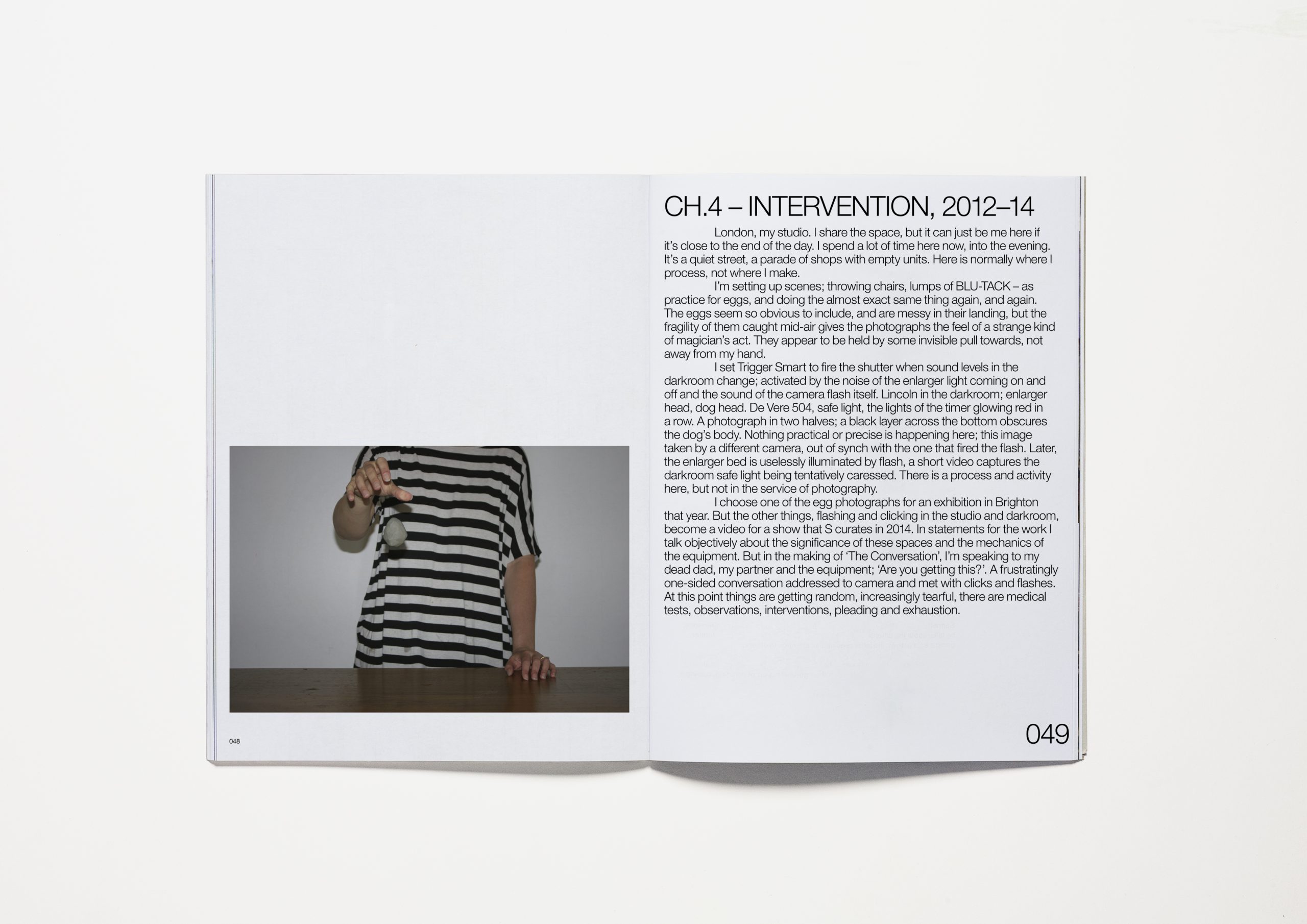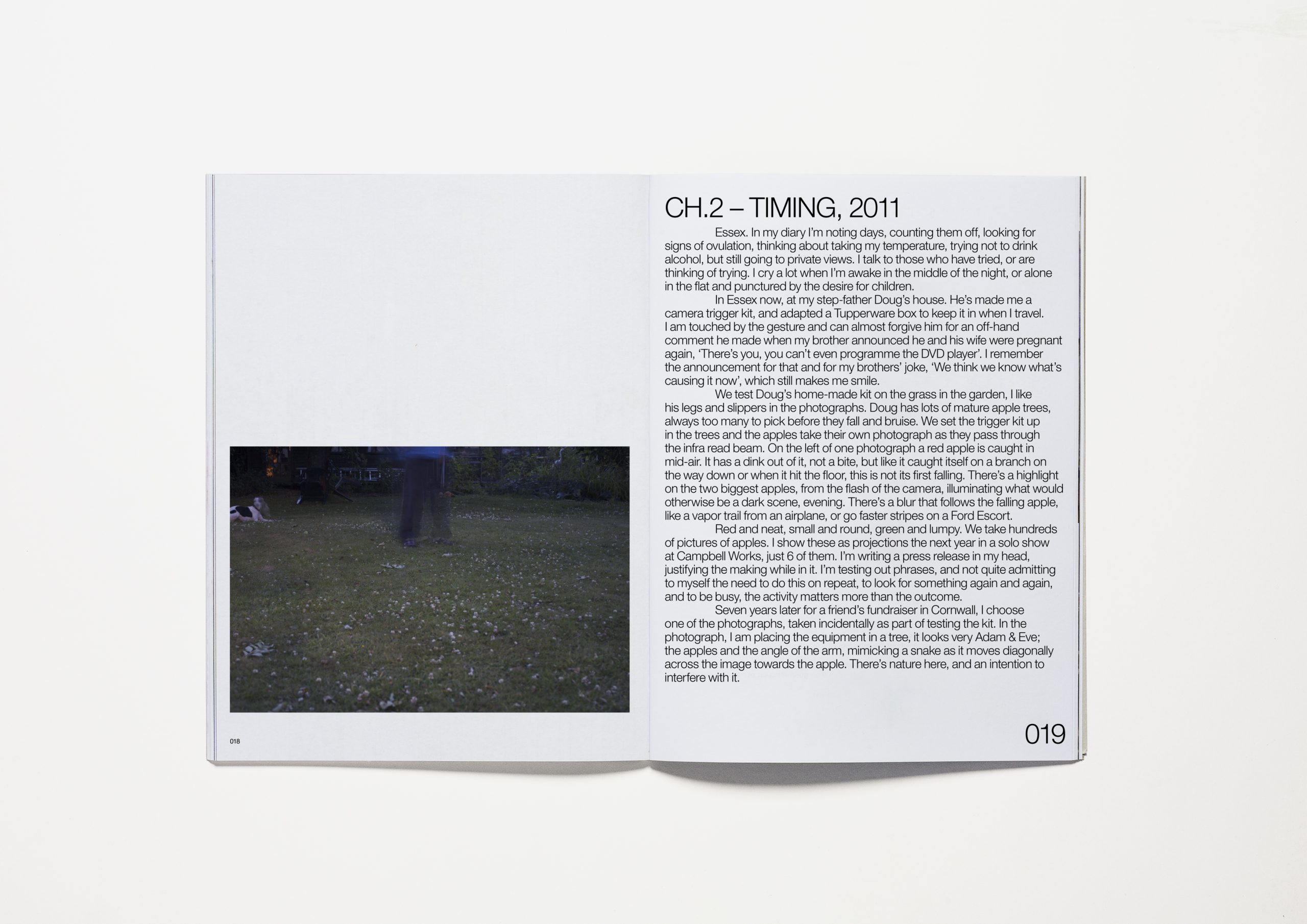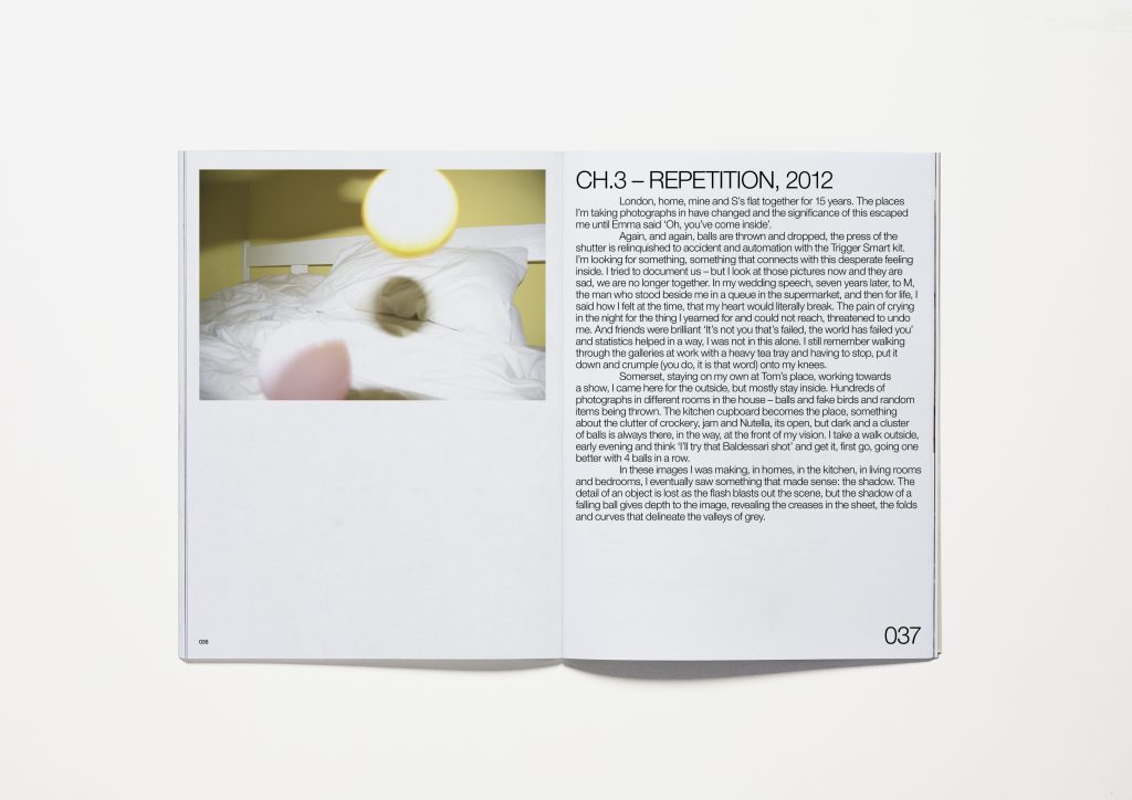 The photographs were made during the years I was unsuccessfully trying to get pregnant. When I looked back at the hundreds of images I had been making, I realised there was an unexpected layer of synchronicity with the photographs and my lived experience. The photographs in the book echo the stages in my life; a hopeful beginning and faith in nature, moving through medical interventions and a belief that eventually fades. The photographs start in nature, shift through domestic rooms, and come to rest in a no-man’s land of studio and darkroom interiors.