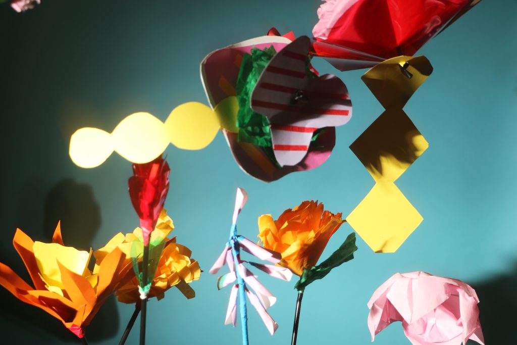 The photographs came from workshops with patients and staff. We made paper flowers together then threw them into the air, using an infra red beam to trigger the camera shutter and capture the flowers in mid flight.